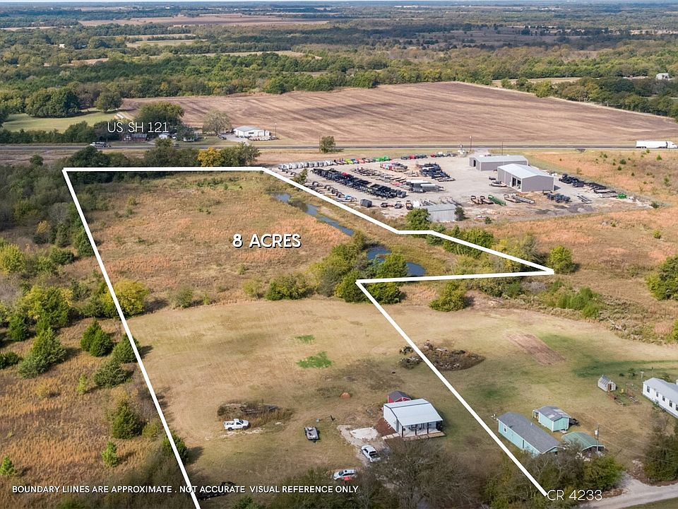 Opportunity Awaits on 8 Acres! Enjoy the freedom to create your ideal country lifestyle with no known restrictions and an excellent location just minutes from SH 121. The property features a 1 bedroom, 1.5 bath barndominium with an office, built in 2022. Inside, the open-concept living area offers a smart, efficient layout and concrete floors that have been coated with Spreadstone flooring. The kitchen is well-designed with great functionality with a spacious pantry and the dedicated office provides flexibility for work or hobbies. Outside, you’ll find 8 acres with a tank, mature trees, electrical hook-up for an RV, and an insulated shed for storage or projects. This prime location near SH 121 provides quick access to McKinney, Sherman, Bonham, and Bois d’Arc Lake, creating the perfect balance of rural tranquility and convenience. Schedule your private tour today!