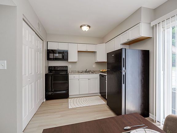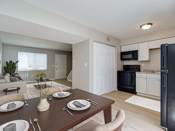 Two-story layoutWhite cabinetsUpdated kitchenCarpeted bedroomsBlack appliancesOver-the-range microwave