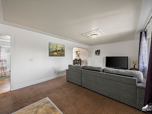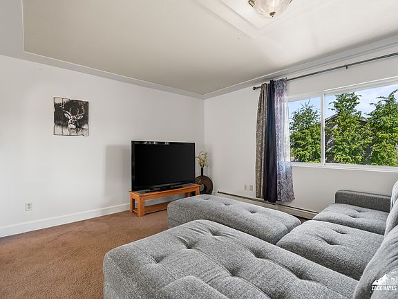 Step into a welcoming open-concept living area featuring a plush, comfortable couch and a smart TV, ideal for unwinding after a day in the snow. The recently updated kitchen includes functional appliances and a breakfast bar, making meal prep simple and enjoyable. Both bedrooms offer comfortable beds, ample storage, and blackout curtains for restful sleep during Alaska's long winter nights.
