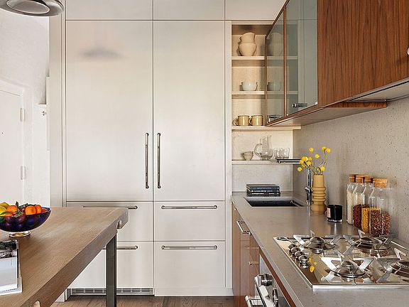 The thoughtful renovation includes new windows throughout, remote controlled mini-split systems for heating and cooling and new white oak flooring. The kitchen features walnut cabinets, high end appliances including a gas cooktop designed as a collaboration between Smeg and Renzo Piano’s Design Studio, a Kohler stainless steel sink, Leibherr refrigerator and maximized kitchen storage. Fireclay handmade tiles in the bathroom are laid out in an arched configuration which feels more like a spa than a shower. This is an inspired and relaxing space that could as easily be in Paris or Istanbul as in New York.