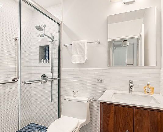 The renovated bathroom features a glass-enclosed shower, contemporary fixtures, and blue penny-tile floors. Ample closet space throughout the apartment completes this well-designed home.