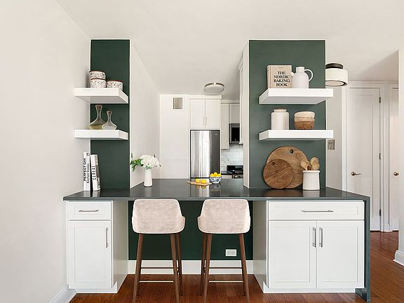 This beautifully renovated residence offers a thoughtful layout with generous proportions and modern finishes. The expansive living and dining room spans nearly 17 feet wide, providing plenty of space for both entertaining and relaxing. Large east-facing windows fill the home with natural light and showcase city views.
