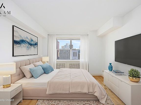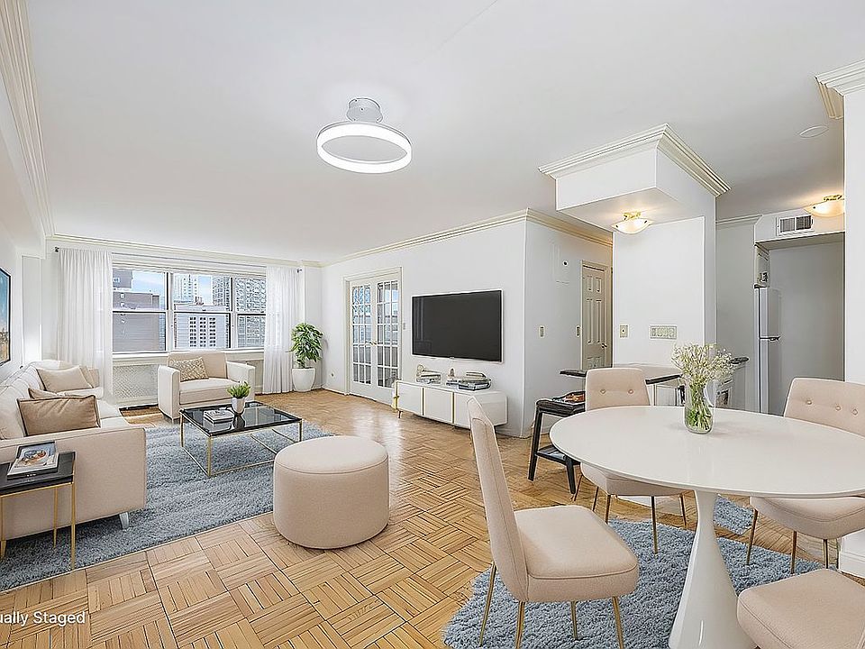 Step into a spacious, bright, and comfortable two-bedroom, two-bath apartment located on a high floor at The Theso Co-op. This sunlit and extremely quiet home features a wall of windows that offers unobstructed Eastern city views. There is an expansive living room, and kitchen is equipped with new appliances, granite countertops and a breakfast bar with tons of storage. This home has renovated bathrooms and parquet floors throughout. The second bedroom has built-in bookshelves which can be used as a home office or bedroom. Additionally, there is an abundance of closet space, including a large walk-in closet in the primary bedroom, with a bathroom ensuite. Custom Hunter Douglas blinds in all the rooms. This lovely home is ready to move into, but it can reach its full potential with your selected upgrades. Please note that additional photos of the living room and bedrooms have been virtually staged.