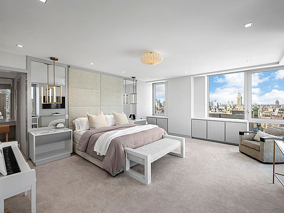 In the heart of the Upper East Side, this townhouse in the sky is five large bedrooms, separate media room, four full baths, powder room, central air-conditioning, double washer and dryer and endless closets. Designed with the precision of a masterwork and the confidence of a collector’s piece. Behind its soaring glass walls, this home unfolds like chapters in a story of modern Manhattan living — expansive, luminous, and alive with the skyline itself. The residence flows from the moment you enter thanks to its loft-like living room framing the sculptural staircase, each space conceived as both sanctuary and showplace.