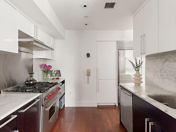 The primary suite features a walk-in closet, a spa-inspired en-suite bath clad with marble floors and counters, floating double vanity, Pietra Cardosa accents, and glass-tile walls. To round out the home is a spacious second bedroom and guest bathroom and an in-unit washer/Dryer.
