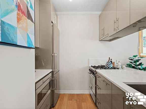 The king-sized bedroom is quietly tucked away and offers a large closet outfitted with california closets and an updated en-suite bath. To top it off, there is the option to add the ultimate NYC luxury, an in unit washer/dryer.