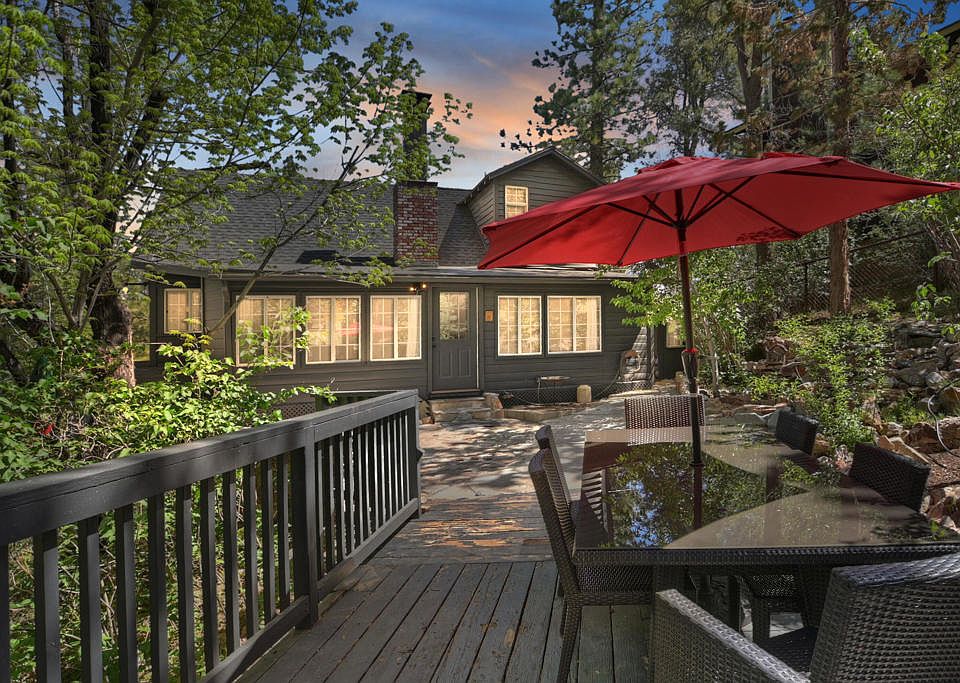 Nestled On A Corner Lot, This 1950s Gem Boasts A Stunning Floor-To-Ceiling Native Rock Fireplace And A Warm Knotty Pine Interior With Vaulted Ceilings. The Home Features Beautiful Hardwood Flooring, Including Hickory With Elegant Walnut Trim. The Main Level Offers A Comfortable Living Room, A Kitchen, A Sunny Sunroom, A Practical Mudroom And Laundry Area, A Bedroom, And A Full Bathroom. Upstairs, You'll Find Two Additional Bedrooms And A Bathroom With A Shower. The Third Bedroom, Currently Utilized As An Office, Is Non-Conforming, Offering Flexible Space. From The Sunroom, You Can Step Into A Relaxing Fenced Backyard. This Outdoor Haven Features A Native Stone Terraced Garden, A Tranquil Waterfall With A Pond, Established Trees, And Lilacs That Enhance The Sense Of Seclusion. The Spacious Hardscape Area Provides Ample Room For A Hot Tub, And The Patio Is Great For Hosting Barbecues. This Property Also Includes A Convenient Two-Car Garage With Extra Off-Street Parking. Nature Enthusiasts Will Appreciate The Lookout Hiking Trail Just A Block Away, Connecting To The Extensive Maple Hill Trails. You'll Also Find Nearby Shops, Stores, And Restaurants Within Easy Reach. The Property Is Approximately 5 Miles From Big Bear Lake Village And Bear Mountain Ski Resort/Golf Course, And About 2.5 Miles From The Shores Of Big Bear Lake. Adding To Its Appeal, The Cabin Has A Newer Roof, An Upgraded Heating System, And Updated Electrical And Plumbing. As A Bonus, A Cinderblock Storage Building Could Be Used For Root Or Wine Cellar And Inventory Of Furnishings Included..
