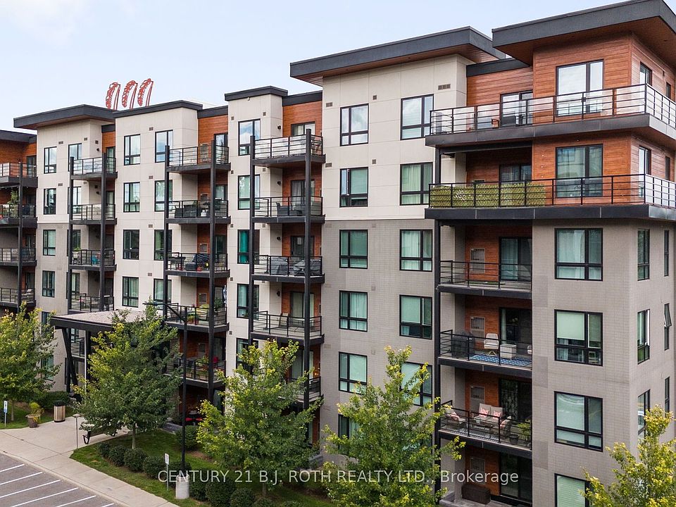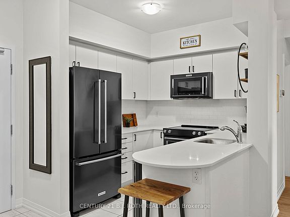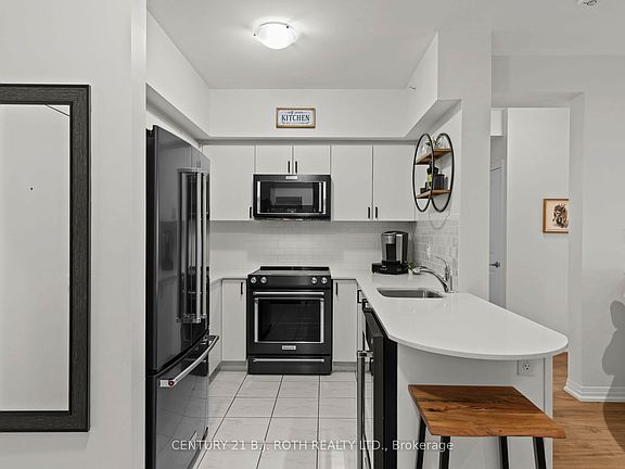 Discover Suite 204 at The Gallery Condominiums, a showcase of modern West Coast style and design in Barrie's sought-after Ardagh community. This beautifully upgraded 2-bed + den, 2-bath suite offers 1,080 sq. ft. of open concept living; blending luxury finishes, comfort, and low-maintenance convenience. As you step inside, the sleek kitchen takes center stage, featuring quartz countertops, subway tile backsplash, top-of-the-line black KitchenAid appliances, and a built-in beverage fridge, perfect for both everyday living and entertaining. The open concept living area is warm and inviting, highlighted by a stone feature wall with a Napoleon electric fireplace, creating a cozy ambiance for movie nights or hosting guests. Large windows offer a serene tree-lined view, complemented by roller shades and pot lights that enhance the condos modern aesthetic. The spacious primary bedroom comfortably fits a king-size bed and full bedroom suite, featuring upgraded closet doors and a stylish 4-piece ensuite designed for relaxation. The large den offers incredible versatility, easily converted into a third bedroom, formal dining room or home office to suit your lifestyle. Additional highlights include an upgraded washer and dryer, fresh paint throughout, a pantry, and a Nest thermostat for smart, energy-efficient living. Step outside to your private balcony, perfect for unwinding or barbecuing a delicious meal. Residents also enjoy exclusive access to the 11,000 sq. ft. rooftop patio, offering panoramic views of Barrie and Kempenfelt Bay, an incredible space to relax or entertain. Just steps from your front door, explore the peaceful 14-acre forested park, ideal for a quiet walk or hike. Conveniently located minutes from Highway 400, shopping, dining, and the Rec. Centre, this home perfectly combines luxury, nature, and convenience in one exceptional package. **1 underground parking spot & locker included. Additional parking may be available for purchase or lease.**