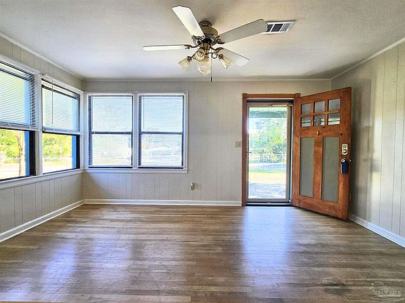 Charming 3 bed, 2 bath family home with a spacious backyard, situated on a fully fenced lot just minutes from downtown, Pensacola Beach, NAS Pensacola, Perdido Key State Park, shopping & dining, and just a quick 10-minute walk to the lovely neighborhood park featuring a playground, pier/launch and picnic areas. The bright living room seamlessly flows into the dining and kitchen areas, featuring new gas range and cabinets, as well as hardwood floors and tile throughout. A versatile bonus room and a full bathroom are conveniently located just off the kitchen. The attached workshop/storage building includes a washer and dryer for added convenience. Step outside to the open patio, offering the perfect space to design your own private retreat in the backyard, with plenty of room to plant a garden. Includes a whole home generator. Offered AS-IS.