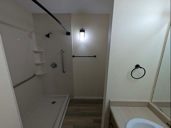 Clean bright shower setupSecure parkingExtra storageBright modern feelFresh paintNew wood flooringUpgraded kitchen cabinets