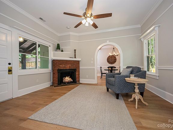 Charming Vintage Cottage with recent updates, sited on 1.99 private ac, with an easy walk, (or golf cart ride) into the village of Tryon. High ceilings, lots of windows for natural lighting & 2 fireplaces, (one is gas logs and one is a wood stove insert). Kitchen features granite counter tops, island, newer cabinetry & appliances as well as space for dining and a large laundry room/pantry. With direct access from the kitchen, you'll enjoy a large screened porch off the front and a new deck off the rear. Primary bedroom is on the main level and features almost 250 sf with walk-in closet, sitting area. Also on the main level is the 2nd bedroom and full bath with lots of great storage. Basement features 2 large rooms, (both with closets) a full bath with walk-in shower and access to the yard. This could be a great space to rent out, if you should need. Storage building to convey. Ample parking in the circular driveway. DEADLINE FOR HIGHEST & BEST IS SATURDAY, JULY 1ST @ 10 am.