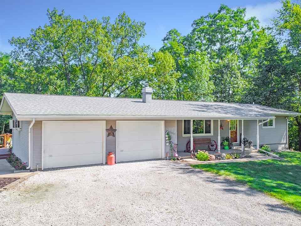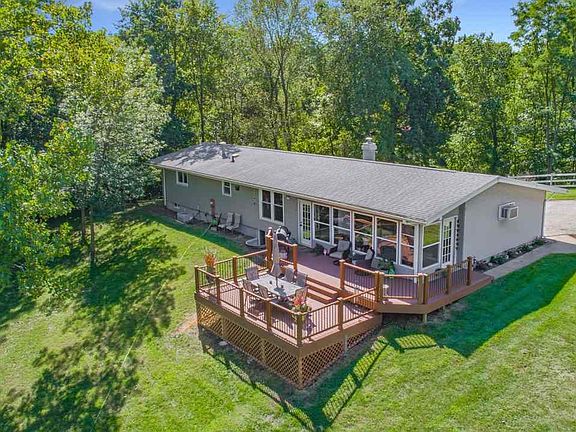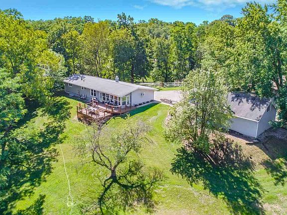 Country paradise! Ranch home is situated on 5.1 acres with a stocked pond! Fenced in area and barn ideal for horses, new in 2017 24x40 insulated barn with a concrete floor. The home has 2,possibly 3 bedrooms, with an attached 2 car garage, and a 24x31 detached garage with a walk up loft. Updated kitchen with granite counter tops is open to the living room featuring vaulted ceilings and a wood burning stove fireplace. Large master bedroom. The sunroom offers a beautiful view of the wooded back yard. The lower level has a full bath, room for a family room and bedroom, currently used as the 3rd bedroom and plenty of storage. Basement remodel was completed in 2017 and includes an egress window. Outside is where you will enjoy the wooded views and occasional wildlife sightings from the newer composite deck, the patio or the inviting covered front porch! The property also features fruit trees, and a creek runs thru it. Seller is providing a home warranty.