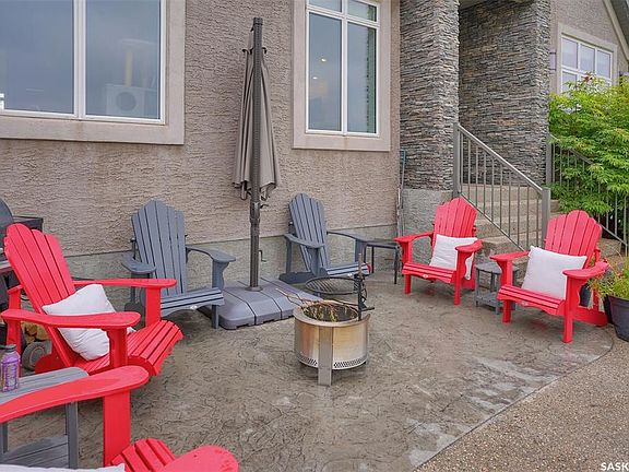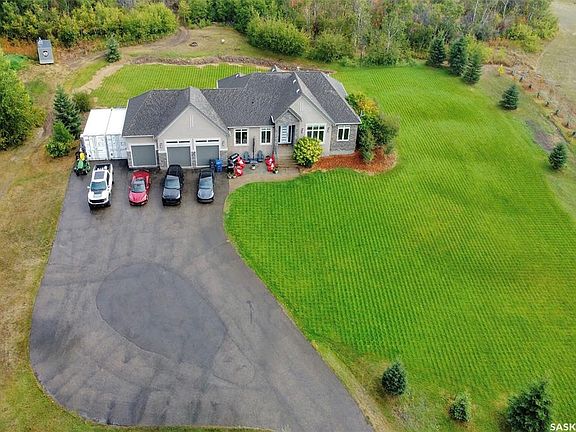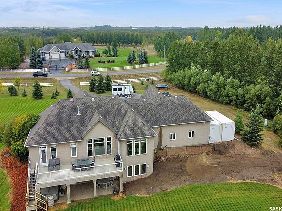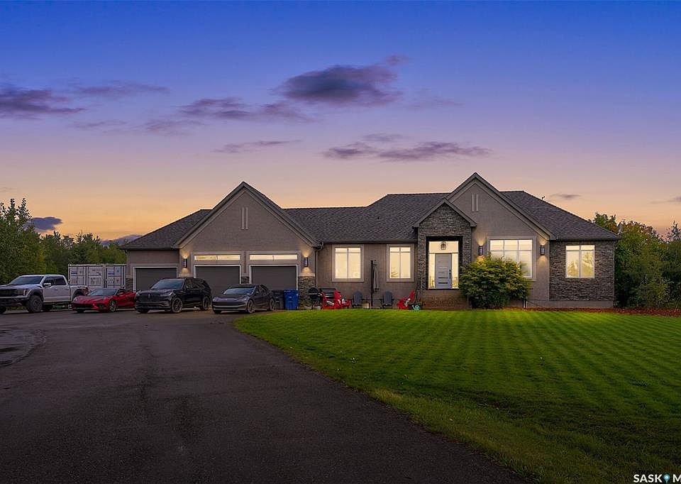 Don’t miss this stunning walkout bungalow nestled on a prime 4.9-acre lot, highlighted by over 2 acres of mature trees complete with private walking and biking paths, a rare retreat just minutes from the city and walking distance to White Butte trails. This 1840 sq ft bungalow offers over 3,600 sq ft of beautifully developed living space with 5 bedrooms, a den, and 3 bathrooms, designed for both family living and entertaining. The exterior showcases stucco and stone finishes with a triple attached heated garage, with gemstone lighting, in ground sprinklers attached to well. A fully paved driveway provides ample parking for guests, trailers, and toys. Step inside to a bright, open foyer with tile floors that lead into the expansive main level. The living room features vaulted ceilings, hardwood flooring, and a striking floor to ceiling fireplace, with large windows that flood the space with natural light and frame picturesque views of your private acreage. The kitchen is both stylish and functional, complete with quartz countertops, a large island, stainless steel appliances, and abundant cabinetry. A convenient walk-through pantry connects to the laundry/mudroom with direct access to the heated garage. The dining area, surrounded by windows, opens onto a wrap-around deck with a gas BBQ hookup, the perfect spot for summer entertaining. The main floor offers 3 bedrooms, including a spacious primary suite with a walk-in closet and a 3-pc ensuite. A garden door off the ensuite leads to the deck, offering a private outdoor escape. A full bathroom with a tiled soaker tub serves the additional bedrooms. The fully developed walkout basement extends your living space with a large recreation room featuring a second fireplace, French doors to a versatile den, 2 additional bedrooms, and a 3-pc bathroom. Walkout access opens onto a covered aggregate patio featuring gemstone lighting and the beautifully landscaped backyard, where the treed acreage and private trails await.