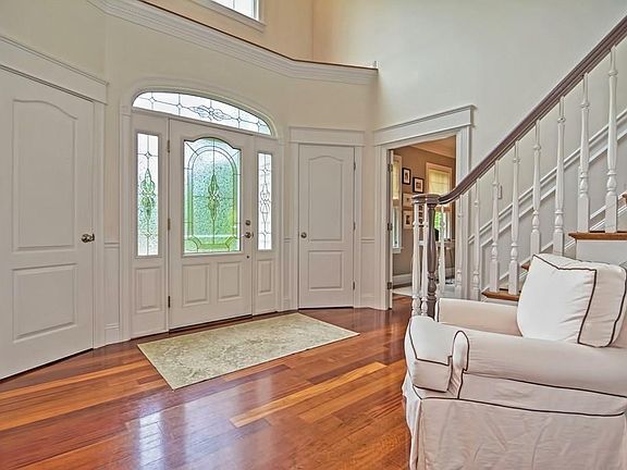 Stunning colonial situated on a private wooded lot with over 4 acres of land welcomes you home! The gourmet kitchen features an oversized center island, stainless steel appliances, a dining area with easy access to the deck, where family and friends can enjoy summer cookouts. The spacious, fireplaced living room features cathedral ceilings and gleaming hardwood flooring that continues throughout the first floor. A formal dining room, half bath, private office with French doors, and a bonus room with custom built-ins round out the first floor. The dramatic two story foyer leads you upstairs where youâll find the laundry room, 3 spacious bedrooms, a full bathroom, and the luxurious master suite. The private master suite offers a sitting area, dual walk-in closets with built-ins, a private balcony overlooking the peaceful backyard, and features a spa-like bathroom with double vanity, custom tiled rain shower, and jacuzzi tub. Oversized 3 car garage with storage and mudroom area.