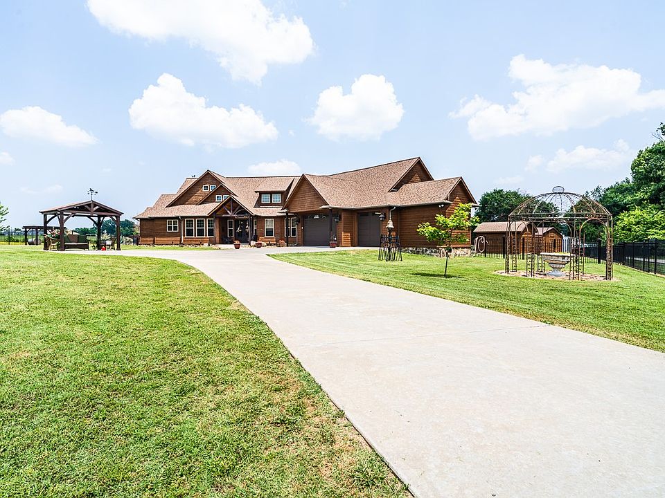Beautiful Gentleman's Farm! Unique Lodge style cedar home, large open floor plan with split bedrooms, iron fencing on 4.39 acres, well maintained, outbuildings for horses and feed/tack storage, 3 car garage, interior wood accents, 8 foot tall interior doors, knotty alder cabinets, plantation shutters, all granite counters, 3 bathrooms, 3 bedrooms, office, two fireplaces, 2 sun porches, covered porch, deck and patio, 2 gazebos, fire pit, 2 HVAC systems, attic storage with stairs, large cedar seasonal closet, hardwood floors, ten foot ceilings throughout, cathedral family room. porch swing, man cave store room, private, concrete driveway, in ground storm cellar, super insulated, great location on paved road, city water, natural gas, cable access, custom built, great family home with ample space for outside enjoyment, Brand new roof installed in August, 2023. HVAC vented into both enclosed porches.