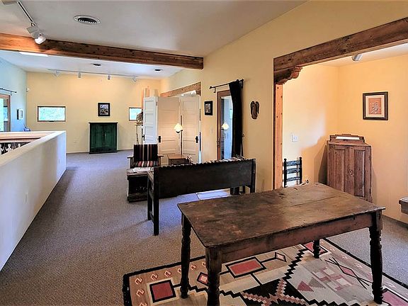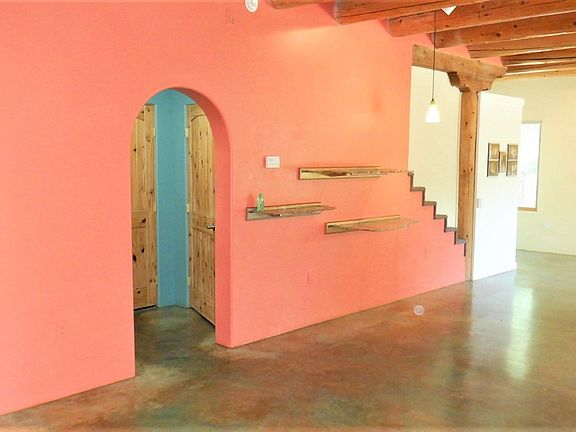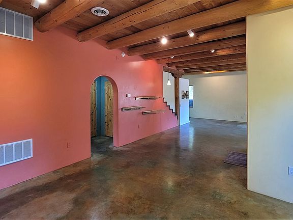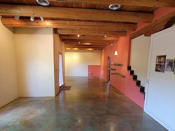 MIXED-USE PROPERTY THREE BLOCKS FROM TAOS PLAZA! This unconventional property, nestled at the corner of Kit Carson Road and Burch Street, is uniquely suited for residential, professional or retail use, as may be permitted by TOT zoning. The ground level has an open floor plan with plentiful light from the expansive windows and has a relaxed southwest feel enhanced with viga ceilings and beautiful stained concrete floors. This space, which includes a half-bath and storage closet, has been previously used as a gallery and oxygen bar. A staircase, which may be accessible from the main space or accessed privately through a side door, leads to the second floor, which offers, on the west side, a very large open residential studio suite, and on the east side, a large open space very similar in size and design as is on the first floor. The studio suite feels cozy yet spacious and features a small kitchen area, kiva fireplace, three-quarter bath and covered portal, and the additional open room may be used for office or gallery, or additional bedroom or living room. There is also an oversized two-car garage. This property is perfectly suited for a couple wishing to combine work and living spaces, as it offers comfortable room for dwelling, ample work areas, and attractive public spaces, and the extraordinary location is suitable for specialty retail or professional offices or services. Still, the use is not limited as the flexible floorplan lends itself to multiple options, which could possibly include adding finishing touches to make it a single residence, a duplex or tri-plex or combining living and rental spaces. The property is zoned R-14, which is intended for multi-family dwelling units in essentially residential urban areas; however, mixed-use is encouraged. Permitted principal uses include personal service retail establishments (with exceptions), professional office or service; and specialty retail establishments such as artist gallery or studio, delicatessens, bakeries, specialty apparel and other specialty merchandise complementary in scale and appearance to the residential neighborhood. Potential buyers are advised to consult the TOT planning and zoning department concerning any intended use.
