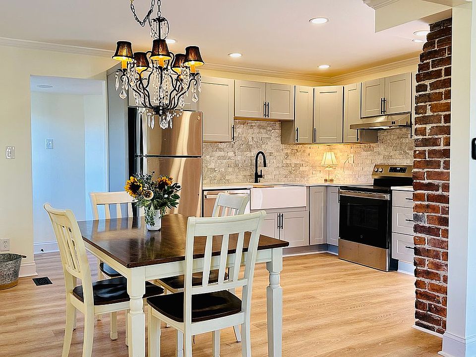 Step inside and be greeted by the warmth of the home. New LVP flooring flows throughout, perfectly complementing the back of an old fireplace displaying exposed brick adding character and history to your living space. The heart of this home is undoubtedly the brand-new kitchen, featuring quartz countertops and a chic quartz ledger backsplash, complete with all-new appliances (excluding washer/dryer).