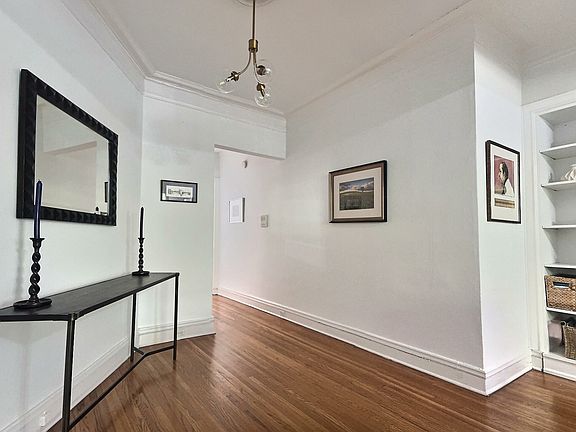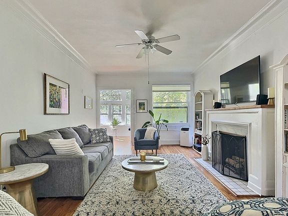 Cozy gas fireplaceCustom built-in bookshelfRefreshed second bathClassic architectural detailsBeautifully maintained vintage buildingFilled with natural lightCheerful sunroom