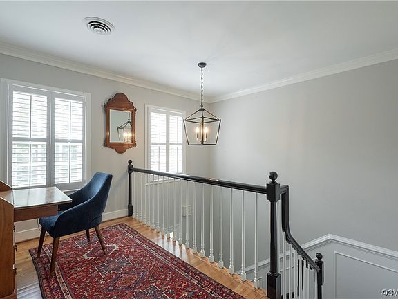 Welcome to this sophisticated expansive condominium that lives like a sunny penthouse above park views of Wesham Green. Enter into a private 2 story foyer and up stairs to almost two thousand square feet of living all on the second level. No details have been missed: Mann Kidwell shutters throughout and a sunroom with walls of windows overlooking the communal patio. Renovated kitchen with quartz counters & stainless appliances. Two wood burning fireplaces - each flanked with built-in bookshelves. Inviting upper landing as secondary study. Of course there is the large open Living and Dining Rooms with beautiful crown molding & newly refinished wood floors. The primary bedroom has wood floors, large in-suite bath and ample closets. The quiet guest room also has wood floors & overlooks the greens. The handsome study has hardwood floors, a sunny bay window and that warm cozy fireplace & bookshelves - add a wardrobe or closet and this room would function well as a third bedroom. Laundry up & coat closets on each level. Reserved & guest parking. Entrance gate house & easy access to Shopping, Schools, University of Richmond & the River Road Corridor.