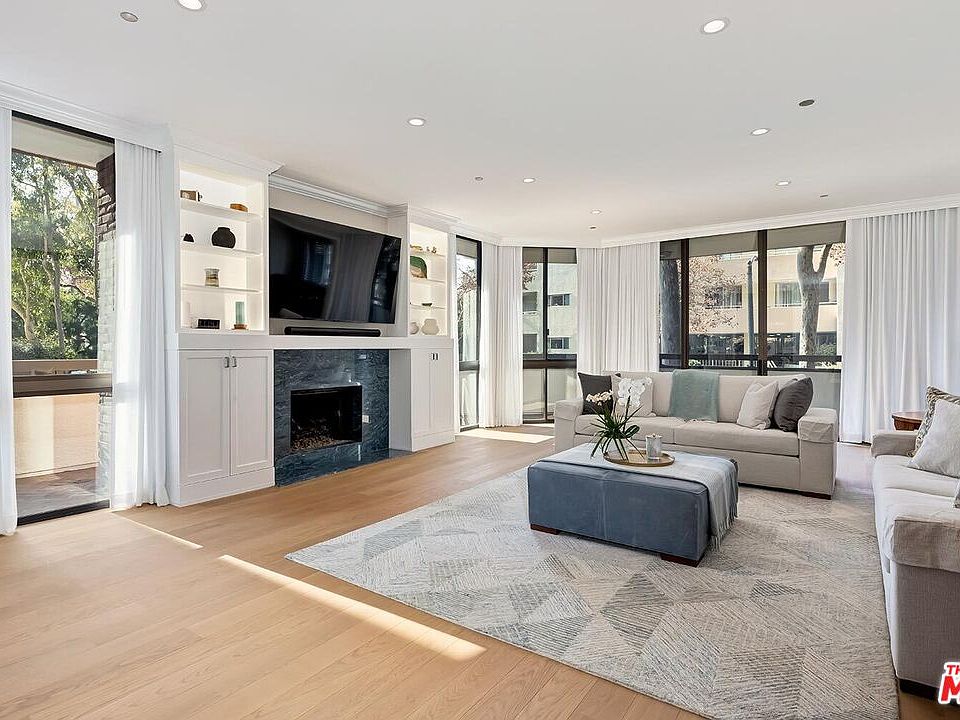 Second floor front south west facing unit with large wrap-around patio, Unit 102. Experience the epitome of luxury living in this meticulously renovated coveted front corner unit on the second level at the full-service IV Seasons condominiums. This 2 Bed 3 Bath with Den and large wrap-around patio with garden views is a masterpiece of design. The unit is flooded with natural light and is adorned with the finest quality finishes, reflecting the sellers' original intention to create and make this their own personal Beverly Hills residence. All renovations were completed in 2024. From the European prime grade oak flooring to the all-new custom cabinetry seamlessly integrated throughout, you are offered the best of functionality and style. Some other features include high ceilings, a formal entry, quartz countertops, Ann Sacks tiles, custom closets, built-ins, wet bar in den, and designer wallpaper adds a touch of artistic flair, while a newly crafted granite fireplace with bespoke built-ins serves as a stunning focal point in the living area. Every detail has been thoughtfully curated, including custom lighting that enhances the ambiance of each room. The IV Seasons is known for its 24/7 full-time doorman, valet parking for residence and guests, a heated pool and spa, and gym. The condo also includes storage. This residence promises an exclusive lifestyle on a beautiful tree-lined street in one of the most coveted neighborhoods and luxury full-service buildings in Beverly Hills.