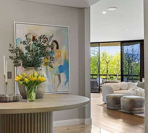 On a tranquil tree-lined street in prime Beverly Hills, this fabulous 2-bedroom plus den, spacious corner unit,offers modern amenities in the prestigious IV Seasons building. Featuring panoramic views of the Hollywood Hills, high-ceilings and loads of natural light, this unit has been thoughtfully appointed with high-end finishes and fixtures. Foyer entrance leads to a grand living and dining room flooded with naturallight and lined by a lovelyterrace overlooking Beverly hills. Custom cabinetry featuring imported wood is highlighted throughout. Primarysuite offers generousheight and volume including an ensuite custom walk-in closet, soaking tub and shower, double vanity sinks and water closets. Secondary bedroom features an ensuite bathroom. Multi-purpose den functions as a media room, office or lounge space and features in-unit laundry. The IV Seasons building offers magnificent amenities including 24/7 doormen, valet parking, a newly renovated pool and spa, gym and storage. Walking distance to shops and restaurants in Beverly Hills, Robertson Blvd. and Cedars Sinai, enjoy the perks of city living with the privacy and security only available in a building like the IV Seasons.