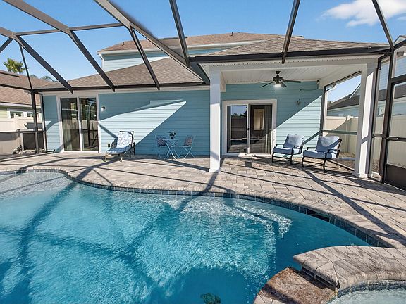 Experience the best of coastal living in this beautifully maintained 4 bedroom, 2.5 bath, 2,270 sq ft home nestled inside the sought-after gated community of Ocean Cay—just 1.5 miles from the beach. From the moment you arrive, the home’s inviting curb appeal and thoughtful design set the tone for a lifestyle of comfort, convenience, and relaxed seaside charm. Step inside to an open and airy floorplan where natural light fills the spacious living and dining areas, creating an ideal setting for everyday living and effortless entertaining. The well-appointed kitchen offers ample prep space and a seamless connection to the main living area, making hosting family and friends a breeze. The first-floor primary bedroom provides the ultimate convenience, featuring generous space and a peaceful atmosphere tucked privately away from the main living areas. Upstairs, additional bedrooms offer flexibility for other house members, guests, a home office, or hobby space. Outside, your personal oasis awaits—complete with a heated screened saltwater pool perfect for morning swims, afternoon lounging, or unwinding at the end of the day. Surrounded by thoughtful landscaping, this space truly extends your living area year-round. At only 8 years old, the home offers the benefits of newer construction along with a newer roof section, ensuring added value and peace of mind. With its unbeatable location near beaches, shopping, dining, and everything St. Augustine has to offer, this home is the perfect blend of modern comfort and coastal ease. Welcome to your next chapter.
