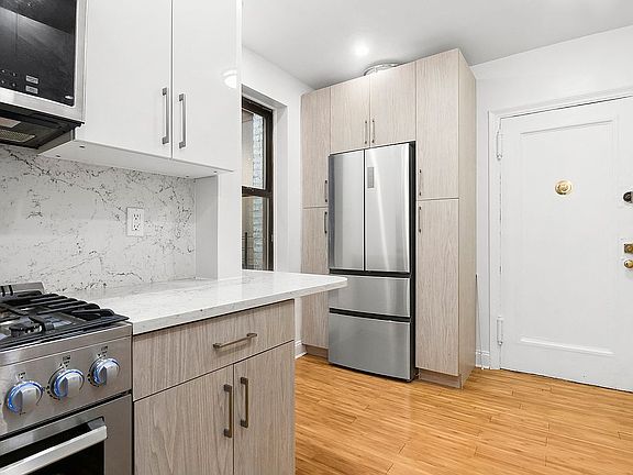 This thoughtfully redesigned former studio now features high ceilings, recessed lighting, and wide-plank hardwood floors. The kitchen is outfitted with high-end appliances and sleek finishes, perfect for modern living.