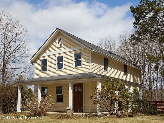 Perched on a hill just outside the village of Saugerties, this cozy farmhouse is the definition of charm. Sunlight pours through every window, catching the warm tones of original hardwood floors and a beautiful wood-burning fireplace at the heart of the home. The layout is open but grounded, with sweet column details separating the living and dining spaces, and a freshly updated kitchen featuring quartz countertops, a new farm sink, new appliances, and direct access to the back deck overlooking a neighboring pond. Upstairs, the vaulted-ceiling primary bedroom feels airy and serene, while a tucked-away nook at the end of the hall makes a perfect sunlit reading spot. The second bedroom is equally inviting, and there's another space that lives like a third. Outside, a fenced backyard offers privacy and plenty of room to stretch out, plus a rustic outbuilding that's ready to become whatever you imagine—studio, workshop, or dreamy garden shed. This home has been lovingly maintained by the Catskill Animal Sanctuary as staff housing, and it radiates calm, care, and comfort at every turn. A rare find under 500K, with just the right mix of old soul and modern ease.