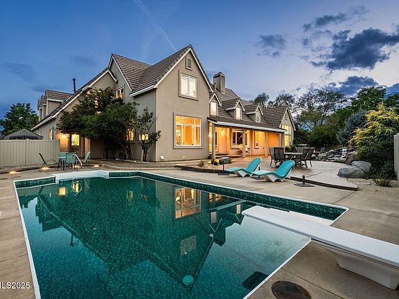 Discover timeless elegance and modern luxury in this custom home located in the private, gated community of Old Washoe Estates, nestled along the north edge of Washoe Lake with breathtaking views of Mt. Rose and the surrounding hillsides. Set on a premium corner lot, this stately property features a three-car garage, RV parking, and an in-ground heated saltwater pool with a pond-less waterfall. The HOA also offers supplemental RV and trailer storage (subject to availability). Step inside to a grand family room with towering ceilings, black walnut floors, and a floor-to-ceiling stone fireplace—a wood-burning, forced-air Xtrodinair unit capable of heating up to 3,600 sq. ft. Enjoy an integrated in-wall surround sound system and custom backlighting that set the perfect ambiance for relaxing or entertaining. The chef's kitchen is a seamless blend of traditional craftsmanship and modern design, showcasing a new Monogram range, handmade hood, concrete island with hearth banding, solid bronze fixtures, and three sinks—plus a warming drawer for effortless hosting. The adjacent Butler's Pantry includes a wet bar, wine fridge, and walk-in pantry, with direct access to the formal dining room adorned with crown molding. Additional highlights include: Primary suite with custom-finished clawfoot tub and large walk-in closet Office/den and mudroom Dual HVAC systems and electrical upgrades throughout Every bedroom is en-suite Patio pre-plumbed for gas This home reflects true pride of ownership and thoughtful attention to detail throughout.