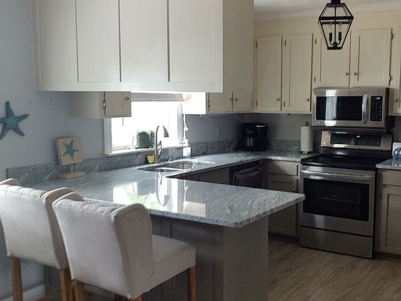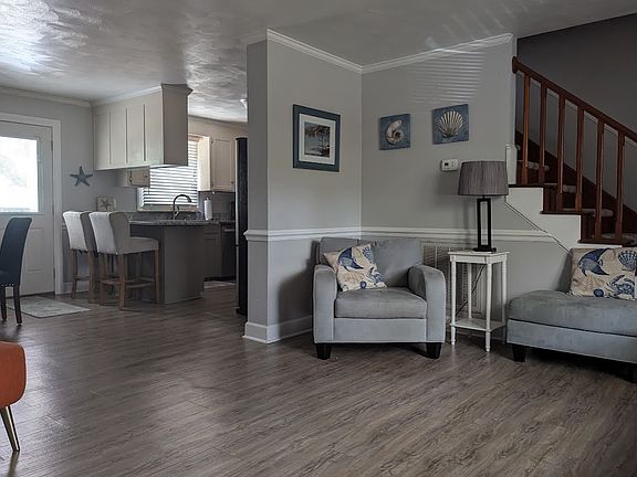 Accommodations in the house include a Master bedroom on the main level with a king size bed and a full bath. Main level has open concept living room and dining area with table for six and a kitchen with island seating for two. Plus a laundry room with washer and dryer.