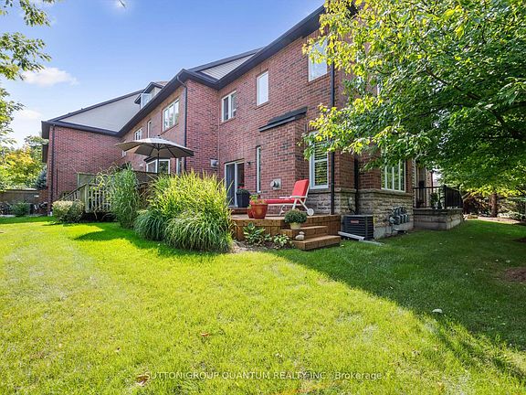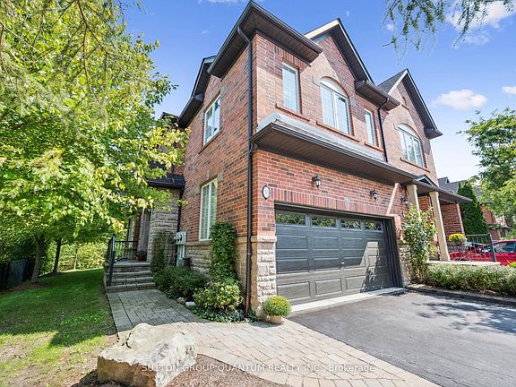 BRIGHT END UNIT LOCATION in the Brownstones, this 2 Bedroom plus Den Townhome with rare 2-car garage offers end of court location and spectacular nature views. Built by Legen creek homes in desirable Wedgewood Creek with its highly regarded schools, this convenient Northeast Oakville location provides easy access to the QEW and 407 for commuters. This unique 2 bedroom plus loft-den end unit townhome is ideally situated fronting onto a tranquil pond and backing onto a lush ravine, and offers access to true natural beauty with the feel of casual elegance. A large living room filled with light from the extra-large picture windows gives view to lush greenery. Gleaming maple hardwood flooring, 9 ft. ceilings with potlights, California shutters, and a classic gas fireplace create warmth and coziness to this gathering space. The kitchen with upgraded maple cabinetry and breakfast room walks out to a new large private two-teir deck. Large 2 car garage has inside access to the main floor. There is a convenient 2 piece powder room on the main floor. Upstairs are two spacious bedrooms, each with windows on all 3 sides of the building, walk in closets and ensuite bathrooms, creating two primary suites. The open concept office separates the bedrooms and the second floor laundry room with linen closet create added convenience. The basement is fully finished and includes a three piece washroom, making it suitable for an additional bedroom, media room, or multiuse space. Trails provide walkability to Iroquois Ridge HS and Community Centre with library and pool and shopping and highwway access a short drive away. Fantastic location! Dont miss your chance to live surrounded by nature in the highly sought after private complex, with all the modern convenience offered with condominium living. The perfect choice for active downsizers.