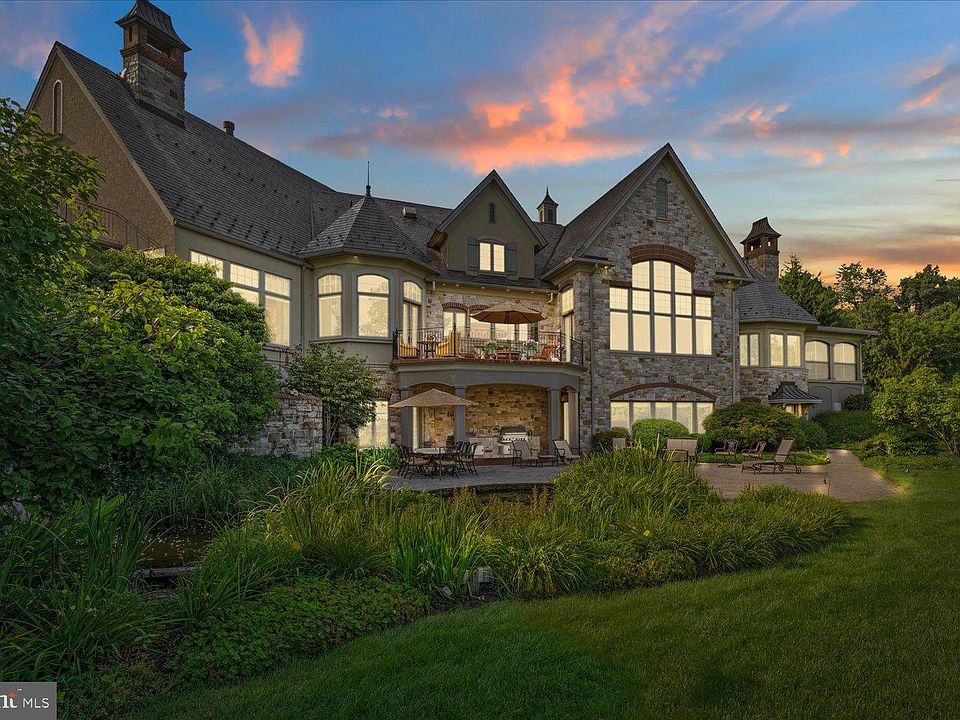 Nestled on a gorgeously manicured lot amid 10 secluded hilltop acres, this five-bedroom, 12,000+ sq-ft architectural masterpiece was lovingly designed by acclaimed architect Don Klinger to provide its owners supreme comfort and functionality while offering breathtaking views of the Susquehanna River Valley from nearly every room. With amenities too many to list (a sampling would include the five ensuite full baths plus four additional half-baths, the six fireplaces, and the 16,000-gallon outdoor koi pond with cascading waterfall), Hawkridge Estate takes mountain-side luxury living to a new level. Situated at the end of a private, wooded drive within a gated community, the mansion features an all-natural stone façade and grey slate roof, with a spacious circular driveway and a broad double garage cleverly hidden to the side. The lofty entrance portico guides visitors into a stately hand-chiseled limestone foyer adorned with shimmering chandeliers and a sweeping, wooden grand staircase that curls upward to the second-floor bedrooms and a luxurious executive office suite. Warm, sophisticated opulence characterizes every room of this three-story home, from the Great Room’s massive 24’-high beams and 1800-lb, no-seam rug imported from Thailand, to the elaborately hand carved millwork of the formal dining room. The expansive chef-quality kitchen features 200-year-old white oak floors, two-tiered solid granite counters, more than ample cabinet space, and a walk-in pantry. The regal owner’s retreat includes oversized closets and a jacuzzi surrounded by stained-glass windows. Hand-painted decorative tray ceilings throughout the house highlight natural motifs of plants, florals, and wildlife, elegantly complementing the house’s soothing earth-tone palette and Country French interior theme. The result is a retreat that is both luxuriously comfortable and hospitality ready.
