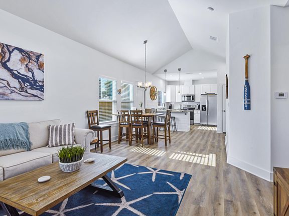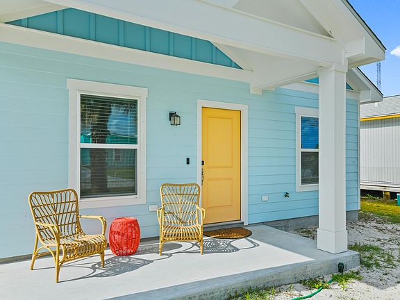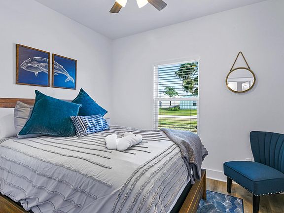 This charming coastal home is move-in ready and fully furnished. Relax on the covered front porch with views of your palm trees. Inside, enjoy 9-foot ceilings throughout and vaulted ceilings in the living and dining areas, plus wood-look luxury vinyl plank flooring no carpet. The home features two bedrooms and two bathrooms, including a primary suite with an attached bathroom and walk-in shower. The second bathroom includes a full bathtub. The kitchen includes modern appliances, shaker-style cabinets, granite countertops throughout, an accent wall on the island, and an oversized pantry or owner's closet for extra storage. Closets are generously sized throughout the home. The yard offers privacy fencing on three sides with a gated chain-link front, and the extended driveway provides ample parking for multiple vehicles or other toys. Located in the Holiday Beach community with access to a private fishing pier, boat ramp, and swimming pool. Just 10 miles from Rockport Beach, fishing piers, and local dining. 12-18 month lease, furnished