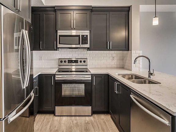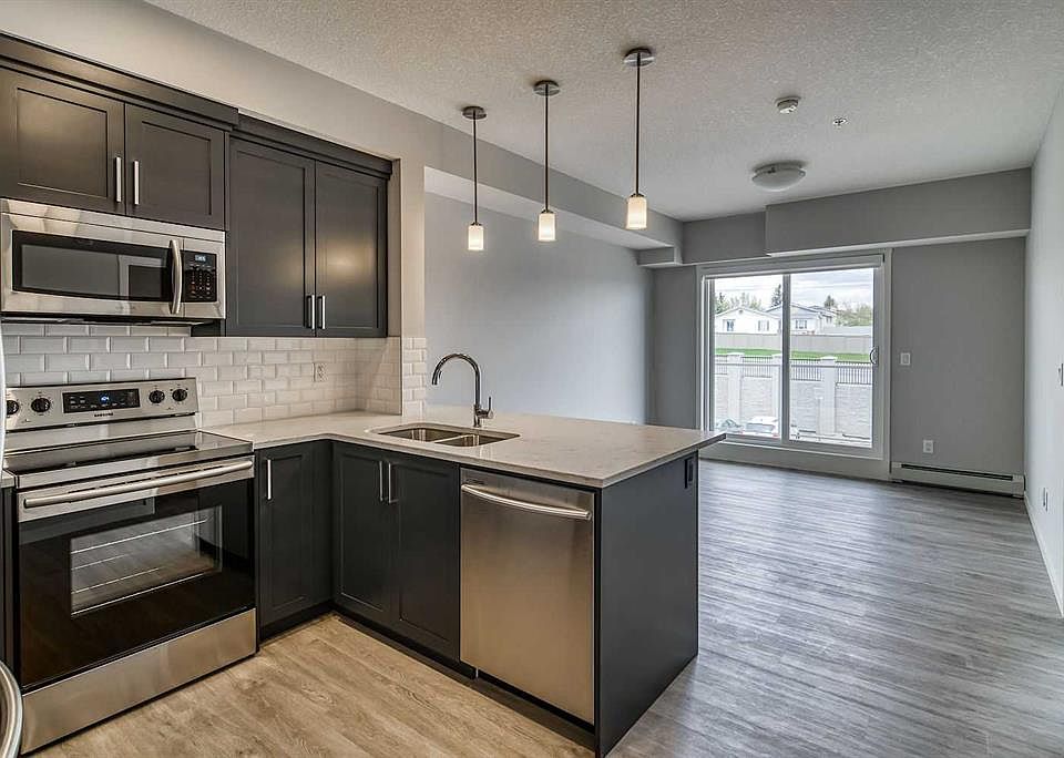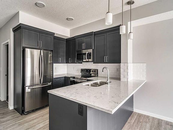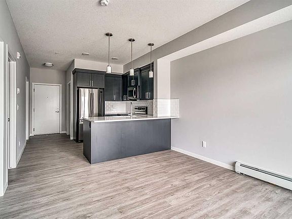 Step into this stylish 2-bedroom, 1-bath condo in the sought-after community of Harvest Hills, where a bright open-concept layout and thoughtful design maximize both comfort and function. The modern kitchen is a highlight, featuring stainless steel appliances, granite countertops, chic subway tile backsplash, and a kitchen island with breakfast bar - for both entertaining and casual dining. The spacious living area is filled with natural light and extends onto a large private balcony - perfect for relaxing or entertaining. The primary bedroom offers an inviting retreat with abundant windows, complemented by a versatile second bedroom that works equally well as a home office, guest room, or family space. Complete with in-suite laundry, a titled outdoor parking stall, and unbeatable proximity to transit, shopping, dining, and every convenience, this home delivers incredible value in a prime location.