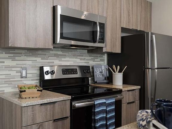 - Exterior features: 24-hour front desk attendant, Availability 24 Hours, Basketball Court, Bicycle storage, Bocce Court, Business Center, Expansive windows with custom solar shades, Game Room, Garbage not included in rent, Heating: Electric, Indoor putting green, Modern kitchens, Online Maintenance Portal, Online Rent Payment, Package-acceptance, Pet Park, Rooftop Deck, TV Lounge, Theater, View Type: City, breakfast bar, granite countertops, stainless steel appliances, under-mounted sinks