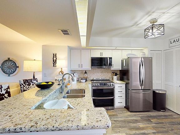 Paradise awaits you at this DIRECT GULF access condo! This beautifully updated 2 bedroom/2-bathroom country/coastal condo is being sold furnished and is ready for one to make it their own. Enjoy the open floor plan and eclectic décor throughout! All flooring is plank ceramic tile and all LG kitchen appliances have been updated. Granite in kitchen and bathroom furthermore updated bathrooms including a ''crown royal barrel sink'' in the guest - a definite must see! All lighting and ceiling fans have been newly installed as well. Stevens Landing is a highly desirable gated community, offering exceptional boating and fishing opportunities. This condo is being sold with one assigned covered parking space and storage unit thereto. Condo amenities include a screened-heated pool and spa, kayaking, tennis-pickleball court, community room, BBQ areas, and a boardwalk to the boat docks accessed through the lush mangroves.