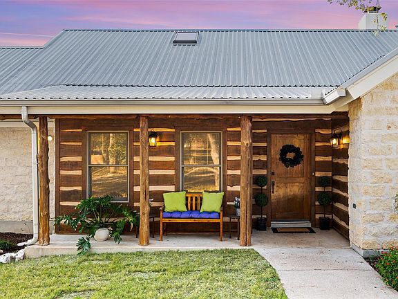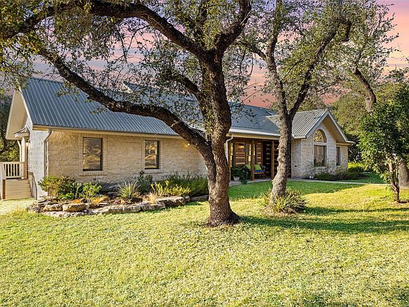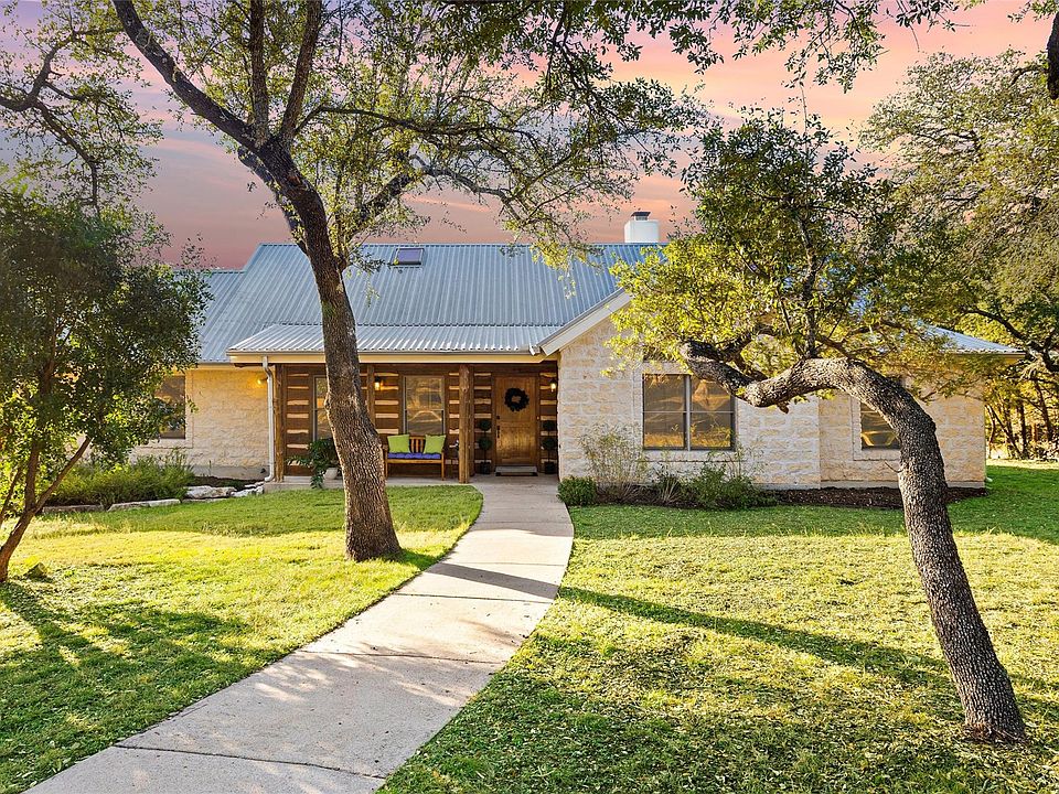 Enjoy sweeping Hill Country sunsets from this private, west-facing retreat on Sundown Ridge. Situated on a secluded 5.09-acre lot with approximately 40 feet of elevation change, the property was selected for its long-range views, mature oak trees, and dramatic limestone outcroppings. Native wildlife, including free-roaming deer, enhances the peaceful, natural setting. Designed for both privacy and flexibility, the property offers an Austin address, low Hays County tax rate, efficient utilities, and zoned to exemplary Dripping Springs ISD. With ample acreage, there is room to add a pool, guest house, additional residence, horses, or explore short-term rental opportunities. Outdoor living is highlighted by a 540-square-foot covered back porch with rustic timber posts, limestone steps, and a concrete floor. Beyond the outer edge of the backyard, the land drops an additional 20 feet, perfectly framing the sunset views. The home features classic Hill Country architecture with a log-style front porch, limestone accents, and an R-panel screw-down metal roof. Built with energy-efficient structural insulated Panels (10" roof panels and 6" walls), the home was awarded “Superior Energy Efficiency” by PEC when it was built. Inside, the open-concept layout connects the living, dining, kitchen, and office areas, accented by terra-cotta style tile floors, vaulted ceilings, exposed beams, skylights, and a stone fireplace. Long-leaf pine trim adds warmth throughout. The kitchen was renovated in 2023 with quartz countertops, subway tile, and stainless steel appliances, and the HVAC was replaced the same year. The vaulted primary suite features French doors, a soaking tub, glass shower, dual vanities, and a skylight. Two secondary bedrooms share a stylish bath, and a large 572-square-foot recreation or game room with a half bath completes the home. This is one you don't want to miss - a rare Hill Country retreat offering privacy, versatility, and convenience.
