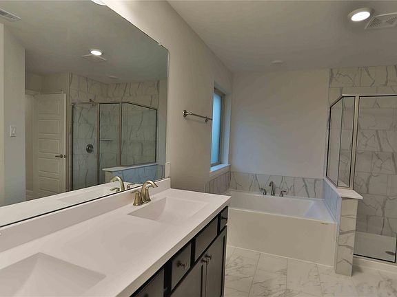 Brick and stone elevationStainless steel appliancesDining areaLarge family roomSplit bedroomsModular tubSpacious plan
