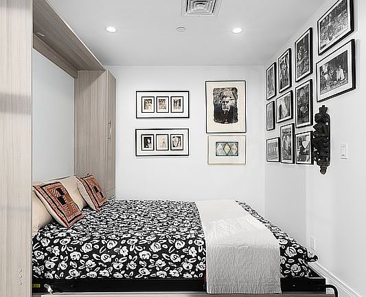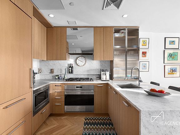 Additional highlights include abundant Elfa-outfitted closet space, an in-unit Miele washer and dryer, and motorized window shades.