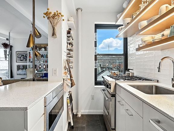 Thoughtfully renovated, the kitchen and bathroom are both streamlined and functional. The kitchen boasts custom white cabinetry and upscale appliances, including a BlueStar range, Liebherr fridge with ice maker, Fisher & Paykel dishwasher, and built-in Sharp drawer microwave. The windowed bathroom includes a walk-in rain shower with premium fixtures and a separate dressing area. The low maintenance includes both electricity and gas—offering smart value in Manhattan.