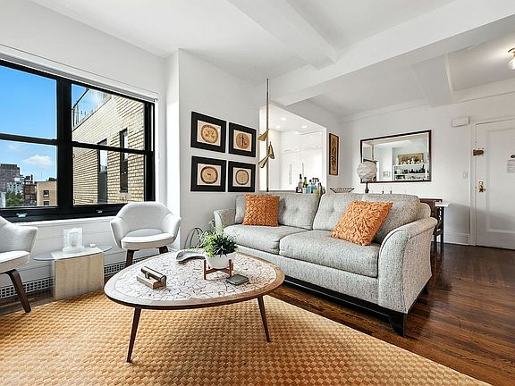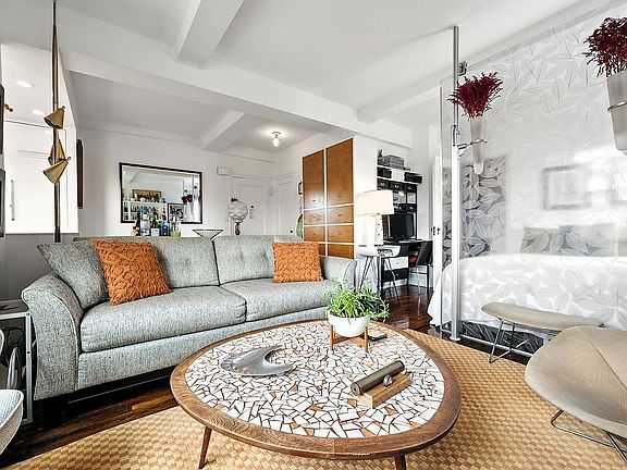 Perched on a high floor in an Emery Roth–designed, pre-war co-op, Apartment 9D blends classic charm with modern functionality. With sunny south/west exposures, the studio is bathed in natural light and features original hardwood floors, high-beamed ceilings, and two ample closets. The open layout carves out distinct living, dining, and sleeping areas, offering flexibility and clarity in how you use the space.