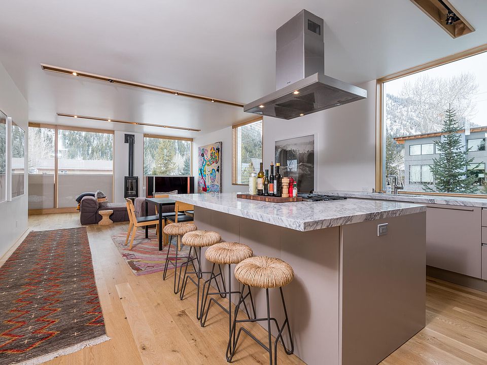 Freestanding mountain-modern townhome in sunny West Ketchum, just blocks from downtown. Blends rugged minimalism with modern design. West-facing with views of Bald Mountain, designer finishes, gated stone courtyard, sun-filled deck, 1-car garage, and separate gear storage for bikes, skis, and toys. No HOA!