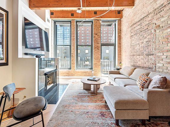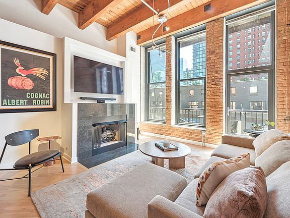 Enjoy this beautiful brick and timber 2 bed /2 bath loft unit in River North. With super sunny south-facing exposure, this end unit fills with light from floor to ceiling windows and features soaring thick-beamed ceilings and exposed brick in every room with two fully enclosed bedrooms. Remodeled in 2021, the kitchen features 42" Edgecomb Gray cabinets, all stainless steel Kitchen-Aid appliances, Artic White quartz counters, translucent glass backsplash, extra deep under-mount sink, faucet with sprayer, and under-cabinet lighting, plus a beautiful new bar area with beverage storage. Hardwood floors have been added new in the bedroom and have been refinished throughout in a natural matte oak finish while the living/dining rooms are open and ideal for entertaining with a new composite decking balcony off the living room. A gas start fireplace is included and perfect for cozy-ups in winter. This split floor plan is ideal for a work-from-home office while still allowing for a complete guest suite. The primary bedroom is large enough for a king-sized bed and the entire unit has been freshly painted with tons of organized closets. A new Bryant 2.5 ton air conditioner was installed in July 2020 plus brand new Lenox furnace in 2025 including a convenient remote control Nest thermostat. Deeded garage parking is available for $25K. A walk-in storage room is also included. Building also has a brand new common roof deck. Location is ideal convenient to plenty of restaurants, bars, transportation and East Bank Club. A loft lovers dream in River North.