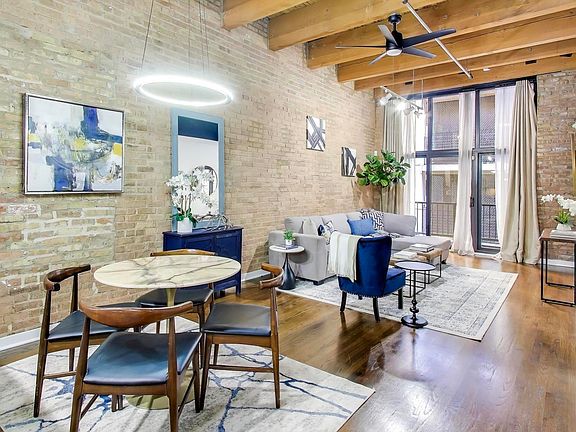 Welcome to this stunning 2-bedroom, 2-bath timber loft in the heart of River North where classic Chicago character meets modern style! Soaring 13'+ beamed ceilings, exposed brick, and refinished hardwood floors set an impressive tone the moment you walk in. This bright corner unit offers a proper entryway with generous storage that opens into a spacious, open-concept living area perfect for entertaining or unwinding in style. The split-bedroom layout enhances privacy, while the kitchen shines with stainless steel appliances, granite countertops, a tile backsplash, and a large peninsula ideal for cooking and conversation. The primary suite features a refreshed bathroom with modern tile and a sleek shower. Enjoy the convenience of in-unit laundry, a large private storage room, and access to the building's fitness center. Step outside to your 12x5 private balcony or head up to the newly renovated rooftop deck showcasing spectacular city views. Heated garage parking included in the price.