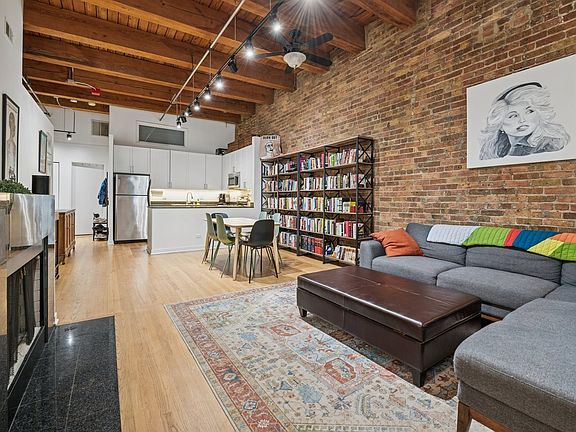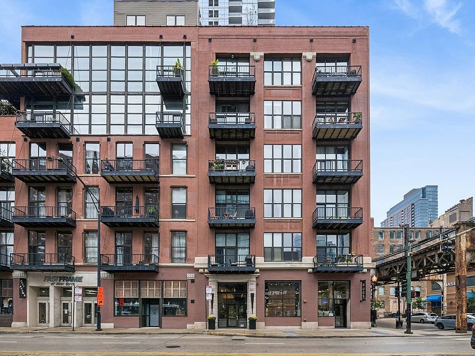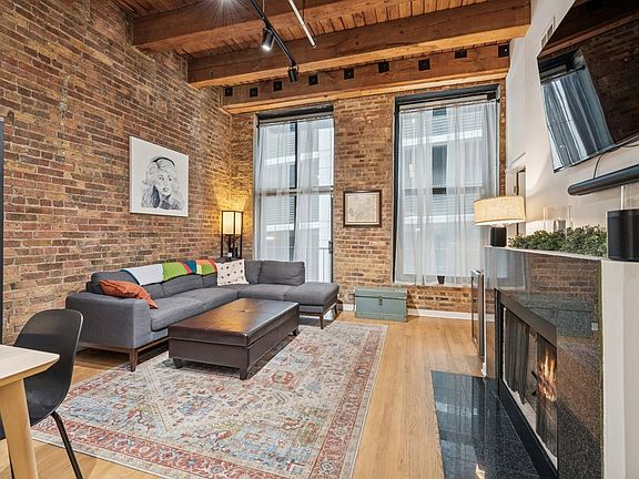 Located in the heart of River North, this character-rich home blends industrial charm with modern elegance. 2-bedroom, 2-bath loft boasting dramatic 13-foot ceilings and hardwood floors. The large kitchen features white shaker cabinets, brushed nickel hardware, LED under-cabinet lighting, and stainless steel appliances, opening into a spacious living and dining area anchored by a cozy gas fireplace. The large primary bedroom easily accommodates a king-size bed and nightstands, with dual closets and an ensuite bath, while the second bedroom includes a built-in Murphy bed that transforms the space into a versatile den or home office. Additional highlights include a private balcony, new in-unit laundry, oversized storage cage, and access to a recently renovated rooftop deck 2 blocks from EL stop! Heated garage parking is available for an additional $25K, making this move-in-ready loft the perfect blend of style, comfort, and convenience.