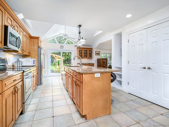Welcome to 300 Winnepoge, a beautifully appointed home in Fairfield's desirable Lake Hills community. Set on a sun-filled corner lot with a large flat yard, this property combines classic charm with thoughtful updates and private association amenities. Step inside to find a spacious kitchen anchored by a 9' center island, granite countertops, and abundant skylights that flood the space with natural light. Hardwood floors with a decorative feature strip border enhance the main level, while the adjoining mudroom with a stone floor provides convenience right off the expansive wrap-around porch. A versatile first-floor flex room with an adjacent full bath offers the perfect space for guests, an office, or even a main-level bedroom. The home offers a generous primary suite with soaring ceilings, a walk-in closet, and a large ensuite bath featuring an updated vanity, separate soaking tub, and shower. Three additional bedrooms include a finished third-floor retreat perfect as a fourth bedroom or private office. A partially finished lower level provides added living or play space, while the two-car garage ensures ample storage. Outdoors, the private backyard oasis is highlighted by mature plantings, a stone patio, and a newer pergola, creating the ideal setting for relaxation or entertaining. Enjoy exclusive Lake Hills Association privileges with access to private beaches, swimming, kayaking, and year-round community events. With award-winning schools and convenient proximity to transportation, shopping, dining, and all that Fairfield has to offer, this home blends lifestyle and location seamlessly. Come see it today before it's gone!
