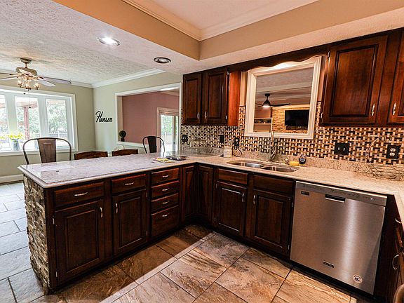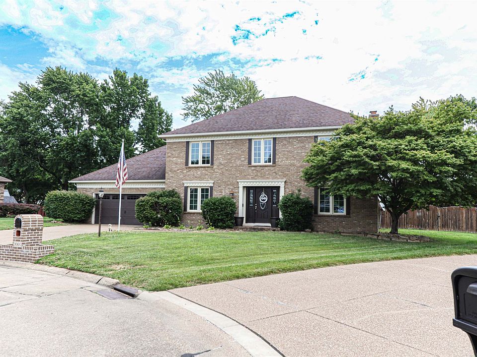 Looking for a large, comfortable house with a backyard set up for fun? This all brick house in Oak View Subdivision is for you. Upstairs has four bedrooms, two recently remodeled bathrooms (huge en suite in the primary bedroom), and bonus room that could be converted to a bedroom. En suite bath has a double sink vanity, fully tiled walk-in shower and luxury soaking tub. Newer luxury vinyl plank floors run throughout the upstairs. The main floor boasts solid hickory wood floors in the family room, living room, and formal dining room. Kitchen with bar seating, breakfast nook and nearby laundry room are tile. In the backyard, you will enjoy a 19 x 40 inground pool which is surrounded by a large wooden deck that was repainted this summer. A covered pool bar with built-in grill, covered patio and stone fire pit makes for a fabulous entertaining space. Kitchen has tiled backsplash, stainless steel appliances, quartz counter tops and plenty of cabinets and counter space. The formal dining room is conveniently located just off the kitchen. Family room has beamed ceiling and fireplace surrounded by built-in bookcases. Front and back staircases. Newer triple-pane windows.