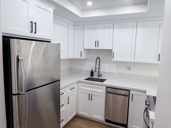 Private patioNew floorsQuartz countertopsNew stainless-steel appliancesShaker cabinetsRemodeled kitchenNew bathroom vanities
