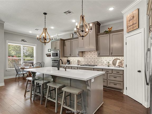 Take a look at this beautiful 3 bed, 3 bath home nestled on a corner lot in the Austin’s Colony subdivision! Step inside and be amazed by the thoughtful design and exquisite details that adorn this home. A few features include recessed lighting, vaulted ceilings, stunning hardwood flooring throughout the main areas complemented by tasteful crown molding. The floor plan embraces an open concept layout, ideal for entertaining. A versatile office space boasts soaring ceilings and one of the guest bedrooms features an ensuite private bathroom. For the culinary enthusiasts, the kitchen showcases luxurious quartz counters, a gas range, built-in oven, microwave, walk-in pantry, and an expansive island with an eating bar. Escape to the serenity of the master bathroom, where you can unwind in a rejuvenating jetted soaker tub or indulge in the walk-in shower. Dual vanities and sinks ensure ample space for two, and the walk-in closet provides plenty of storage. Complete with a covered patio featuring a spa/hot tub, covered custom pergola with temperature-controlled swim spa that sits on recently poured foundation with treated stained wood, creating an inviting spot to relax and unwind year-round. Lights on the pergola are independent from the house. The green space behind the home offers added privacy and tranquility. Its location offers easy access to the nearby Messina Hof Winery, & commuting is a breeze with convenient access to Highway 6.