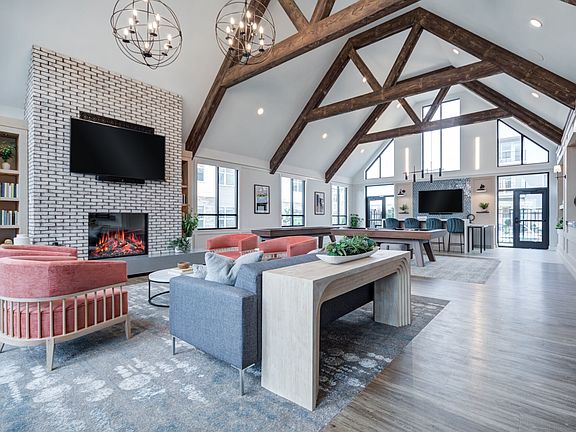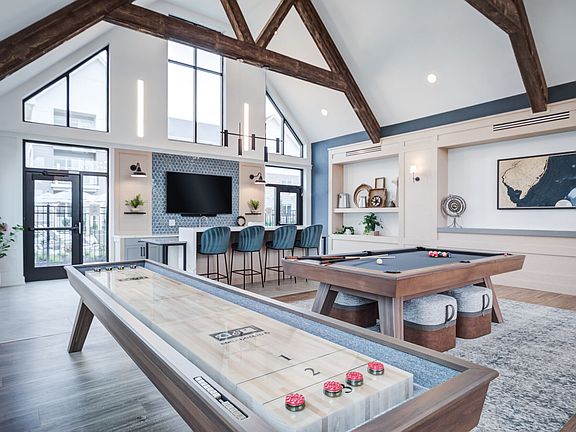 - Exterior features: , 2 pickleball courts, 7 acres of dedicated green space, Amenity Convenience, Artfully crafted 1, 2 and 3 bedroom apartments, Barbecue, Basketball Court, Business Center, Conference Room, Coworking space with work pods, Custom cabinetry with open display shelving, Distinctive quartz countertops, EV charging stations, Fire pit lounges, First Floor, Game Room, Garden, Kitchen window available, Outdoor spaces with gazebos and hammocks, Package Receiving, Pet Park, Pet spa with grooming stations, Private Patios and Balconies, Private entrances with walkout access available, Putting green, Sleek glass-enclosed showers available, Sleek plank flooring throughout living spaces, Spacious bi-level townhome-style apartments, Stainless steel appliances, TV Lounge, Tech-savvy keyless entry, Three designer color palettes, Under-cabinet LED accent lighting, WiFi throughout amenity spaces, Yoga studio and Peloton spin room